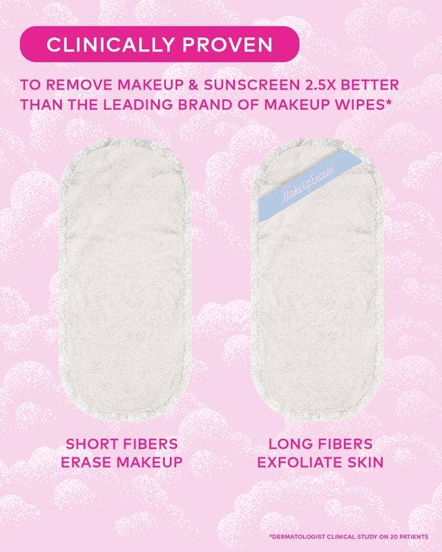 Erase all makeup with JUST WATER including waterproof. Our patented, water-activated, cloud-soft fibers gently & easily remove all makeup & sunscreen from pores. 2 in 1 benefit: one side erases makeup & one side exfoliates skin.